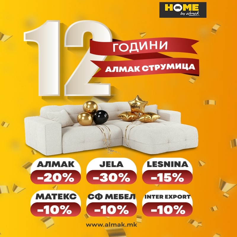 Овој месец Алмак слави 12 години успешна работа во Струмица – 12 години во кои заедно со вас градевме топли и модерни домови, ја оживувавме вашата визија за уредување и веќе повеќе од една деценија сме дел од вашиот секојдневен избор за мебел и ентериер. Од првиот ден па сè до денес, нашата цел беше едноставна: да понудиме квалитет, удобност и дизајн кој инспирира.