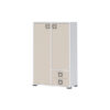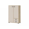 Комода за детска соба, од колекцијата Kiki, со две крила и две фиоки. Распоредот на крилата може да се промени, a во зависност од положбата на пократкото крило, фиоките може да се монтираат во аглите, така што овој елемент може да има четири различни изгледи.