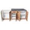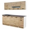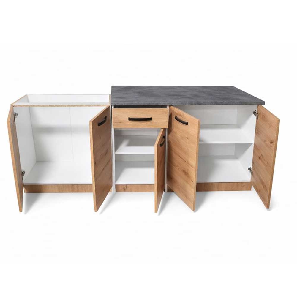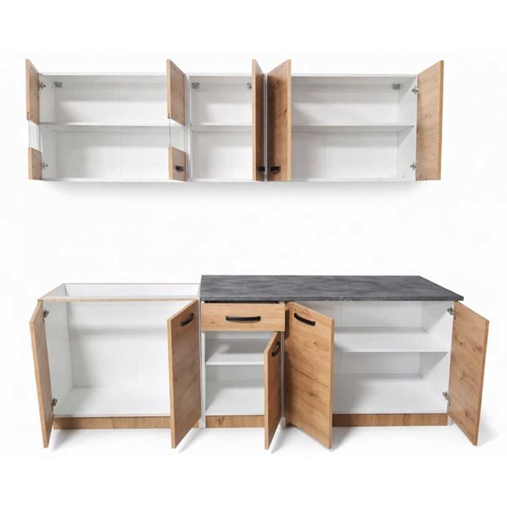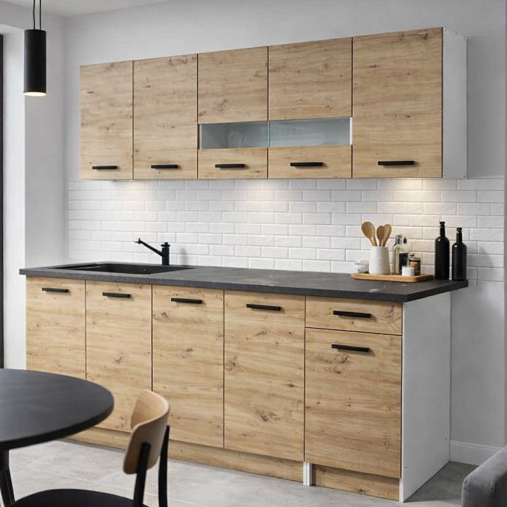 Практична блок кујна Ана со ширина од од 200cm, изработена од иверка во артисан дезен. Пружи функционалност и пријатен изглед. Долниот дел содржи една фиока која овозможува практично организирање на приборот за јадење.