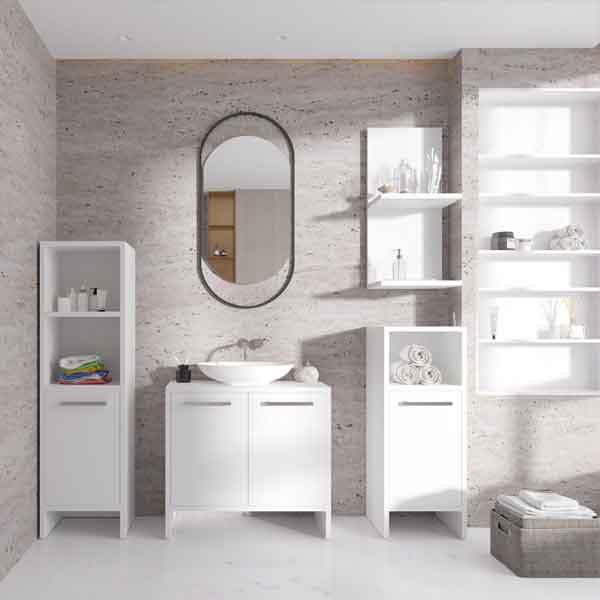 Модерен и функционален бањарски елемент во бела боја, дизајниран да внесе стил, практичност и уреден изглед во бањата.